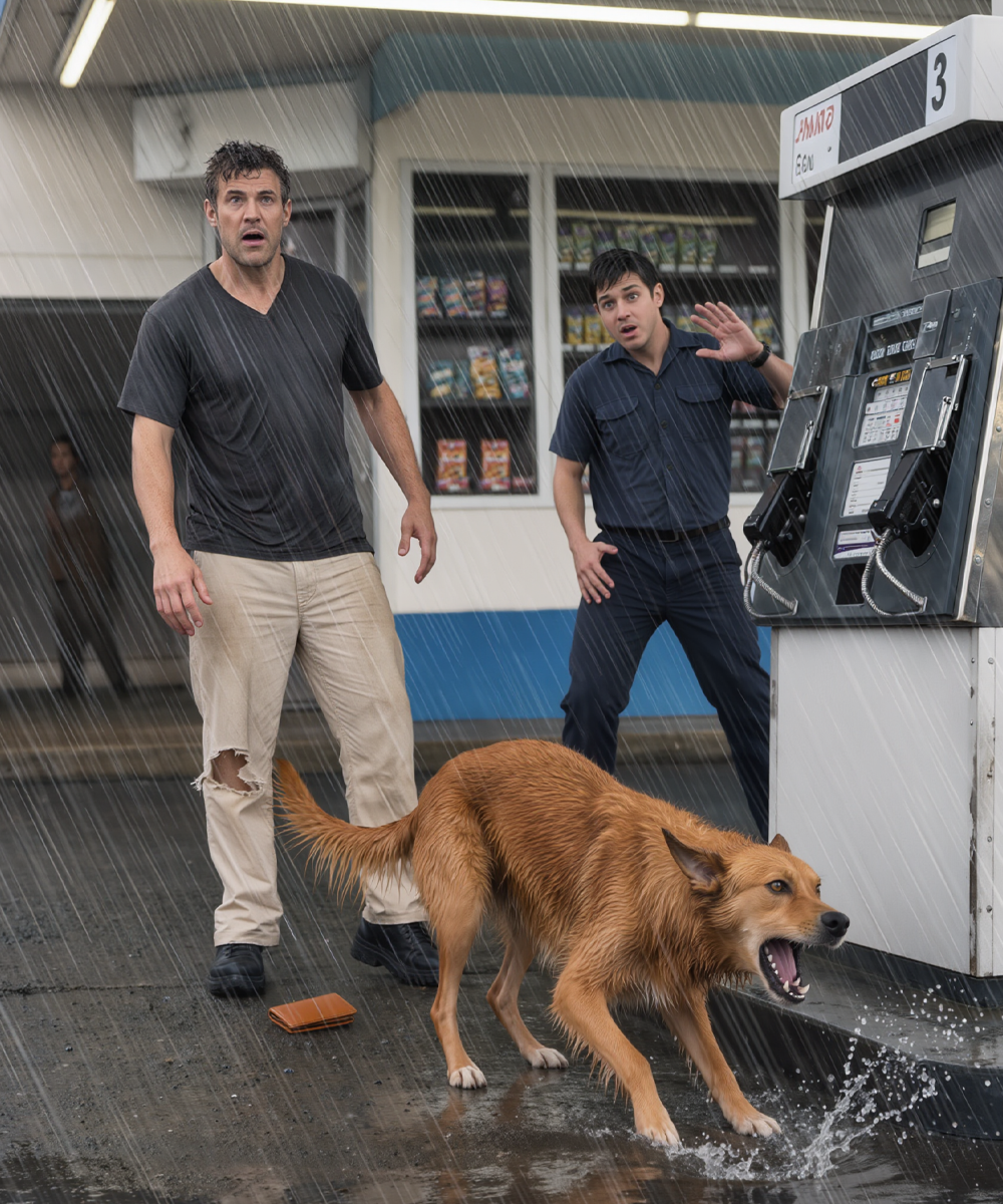 When the chaos calmed, the reddish-brown dog sat quietly near the pumps, tail wagging as if nothing extraordinary had happened. The same men who had cursed him minutes earlier now knelt beside him, patting his wet fur with shaking hands.