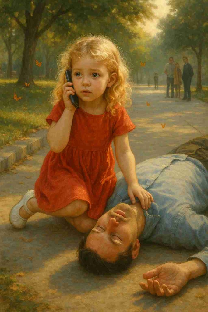 Without hesitation, she ran toward the man, knelt beside him, and placed her tiny hand on his chest. “He’s breathing,” she whispered softly, then grabbed his phone and called 911. “There’s a man sleeping on the ground, and he won’t wake up. Please send help.” That single act of courage saved a millionaire’s life — and unknowingly reunited a father with the daughter he never knew existed.