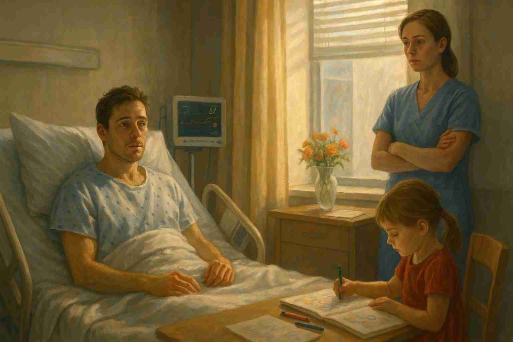 “Man in hospital bed, woman standing near window, little girl coloring nearby.”