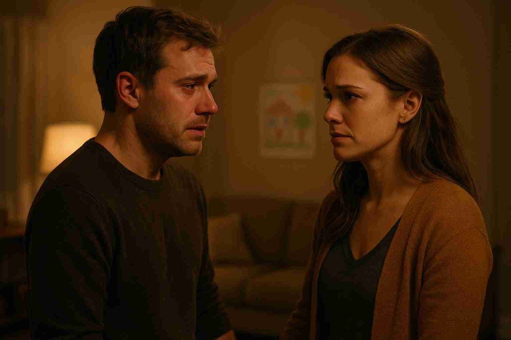 “Man and woman standing close, emotional moment, tears in eyes.”
