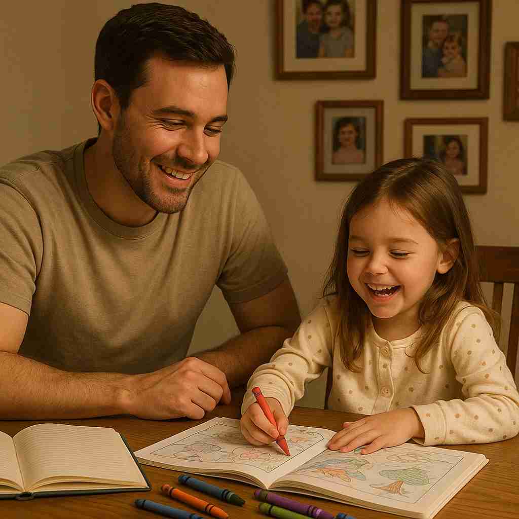 “Father and daughter smiling at table doing homework together.”