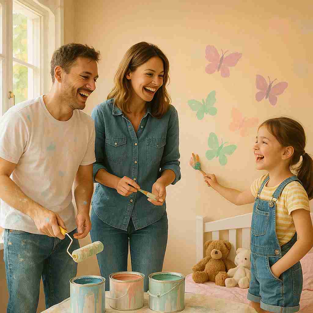 “Family painting child’s bedroom together, happy and relaxed.”