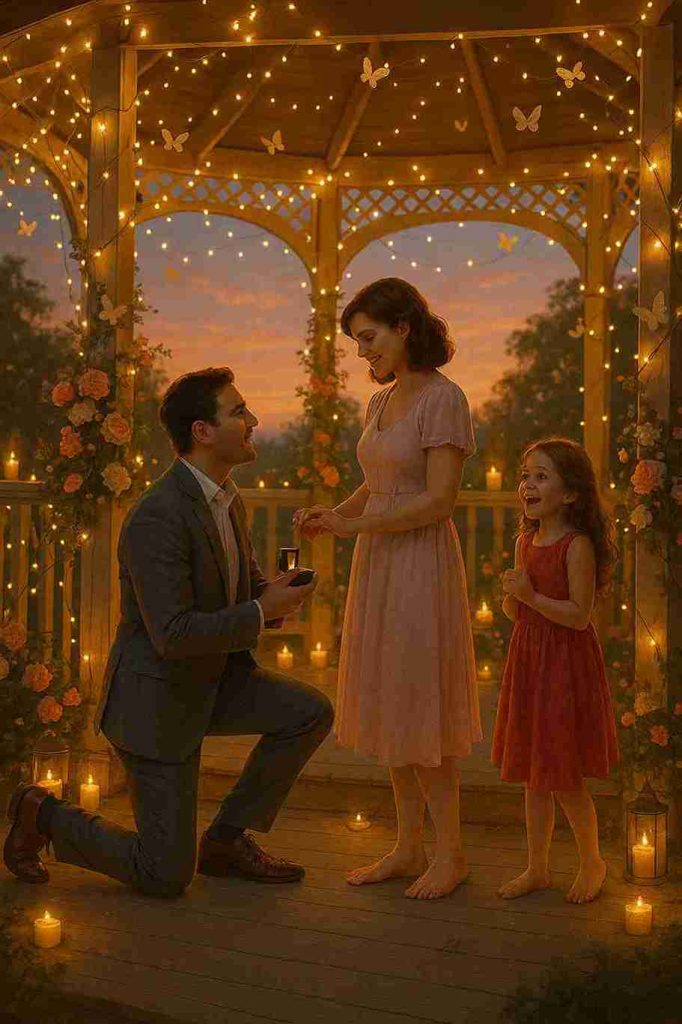 “Man proposing under gazebo lights, woman smiling, child clapping.”