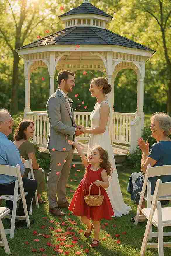 “Outdoor wedding with family, flower girl scattering petals, happy couple smiling.”