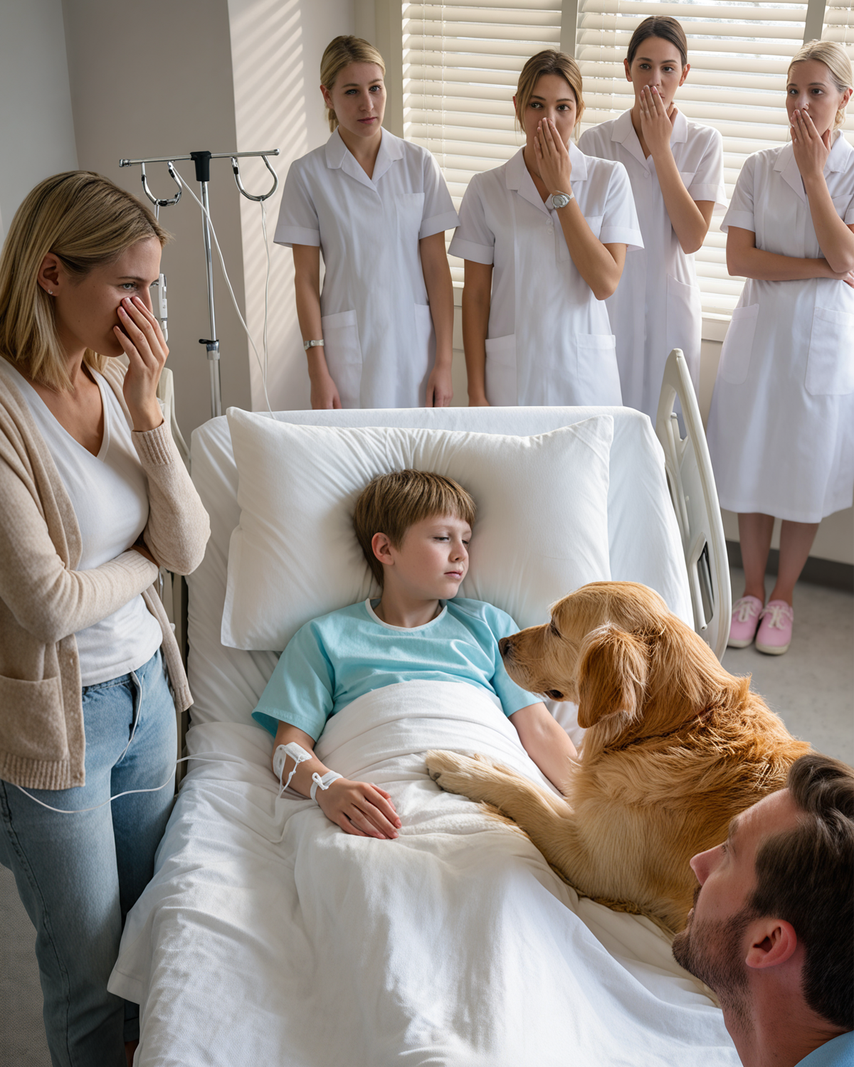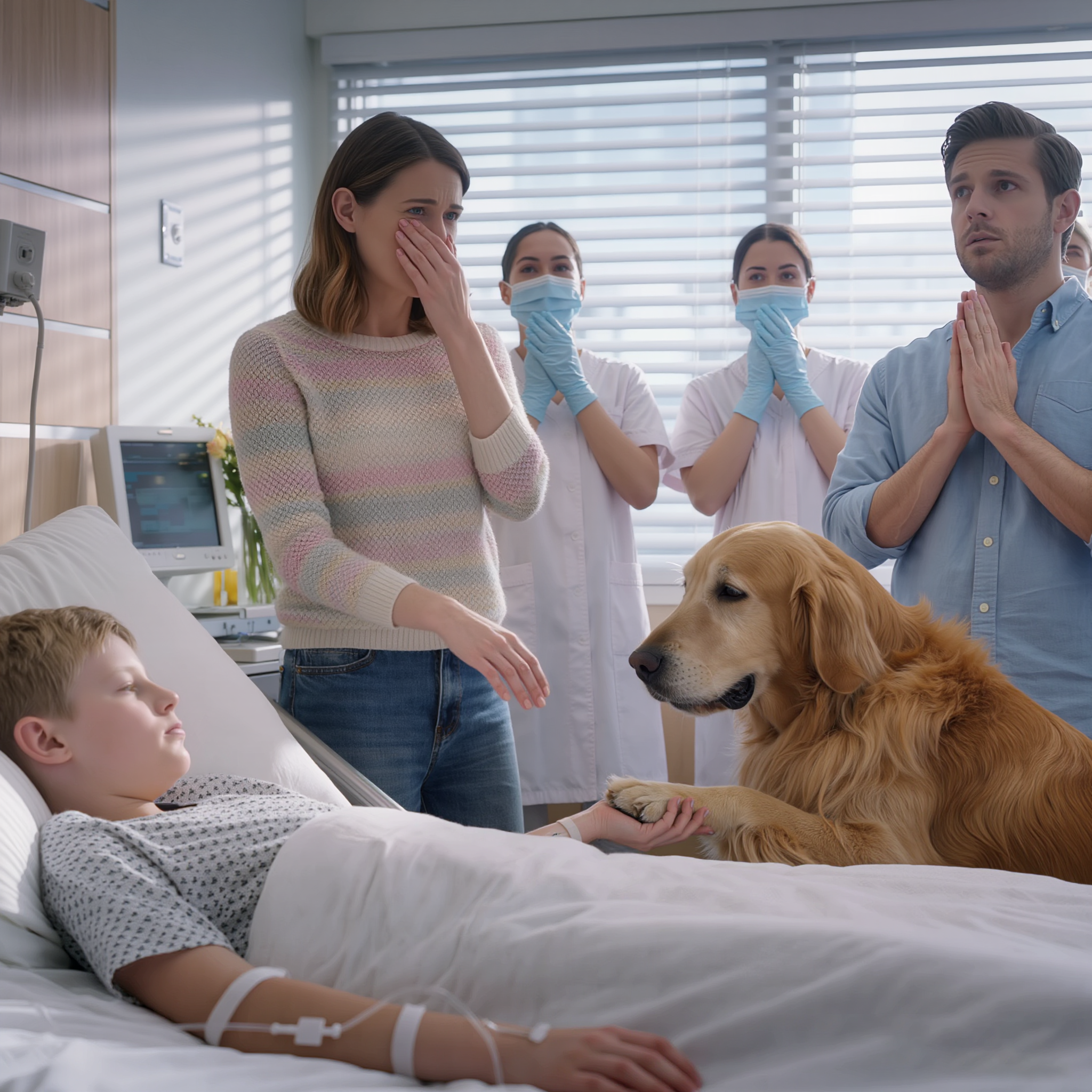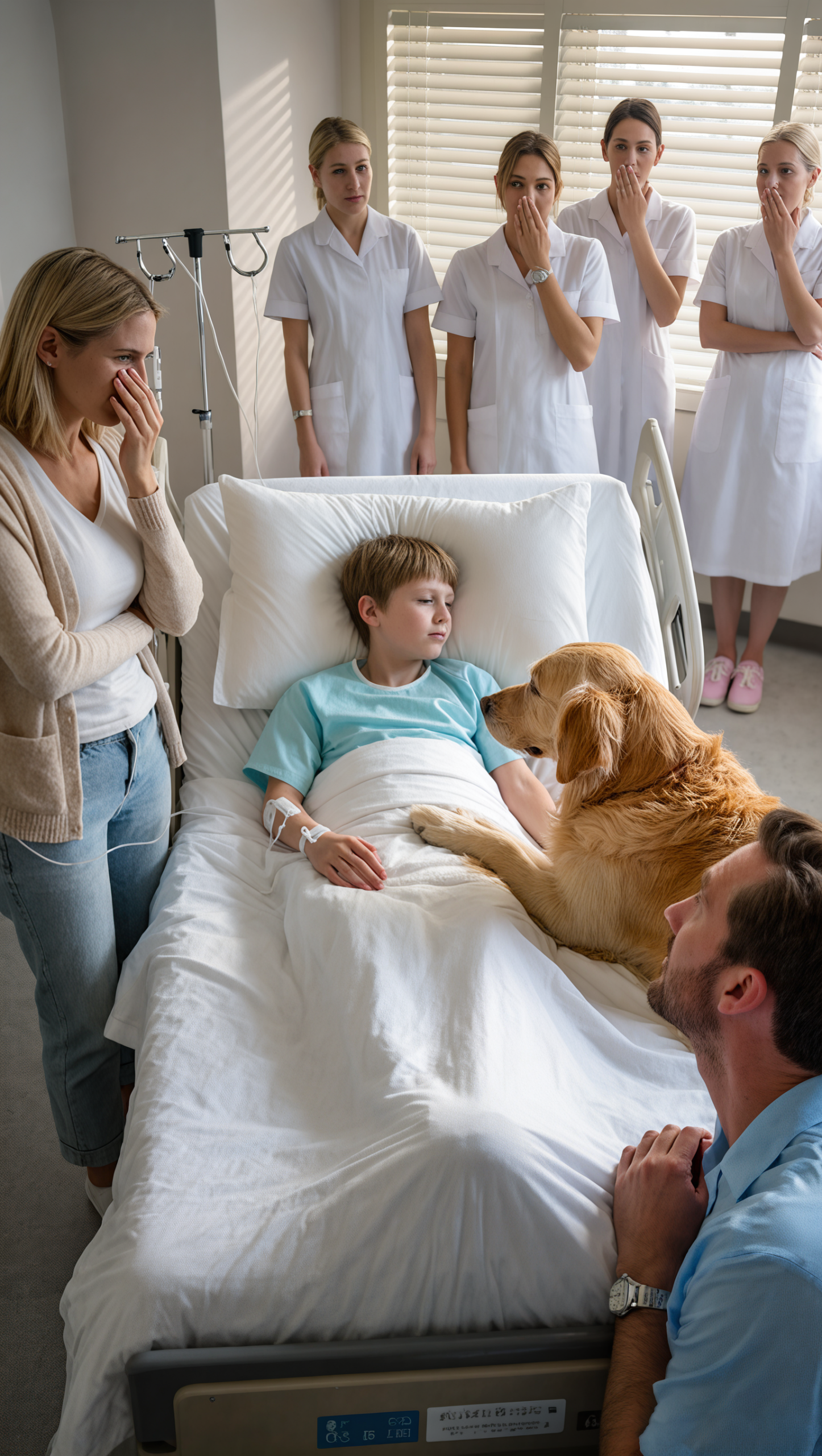That was what nurses whispered as they passed the hospital room. Inside, a fragile boy lay silent, tubes connected to his small body. At his bedside sat Max—a golden retriever with patient eyes, refusing to leave, as steady as the rise and fall of his chest.