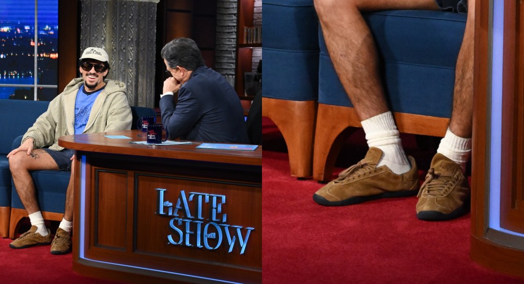 Bad Bunny fits that philosophy perfectly. The man has headlined Coachella, snagged eight Grammys, and redefined masculinity — all while keeping his swagger intact. When he presents Colbert with a pair of custom sneakers from his Adidas line, scrawled with the words “Abuelo Perrea” (“Grandpa Dances”), the audience loses it.
