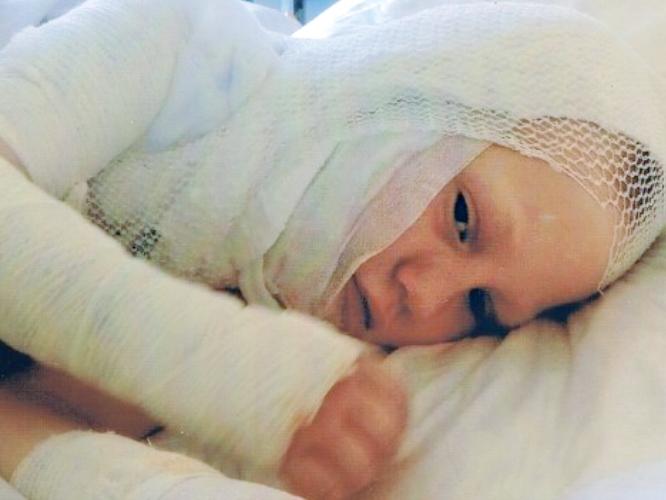 Burn rehabilitation is long and merciless. The creams and bandages must be applied daily, and the custom compression suits — essential to prevent scarring from tightening the skin — need to be replaced as he grows.