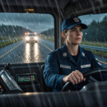 I gripped the steering wheel of the supply truck, knuckles pale under my damp gloves. The headlights carved two thin tunnels through the gray wall ahead, the highway glistening like poured oil.