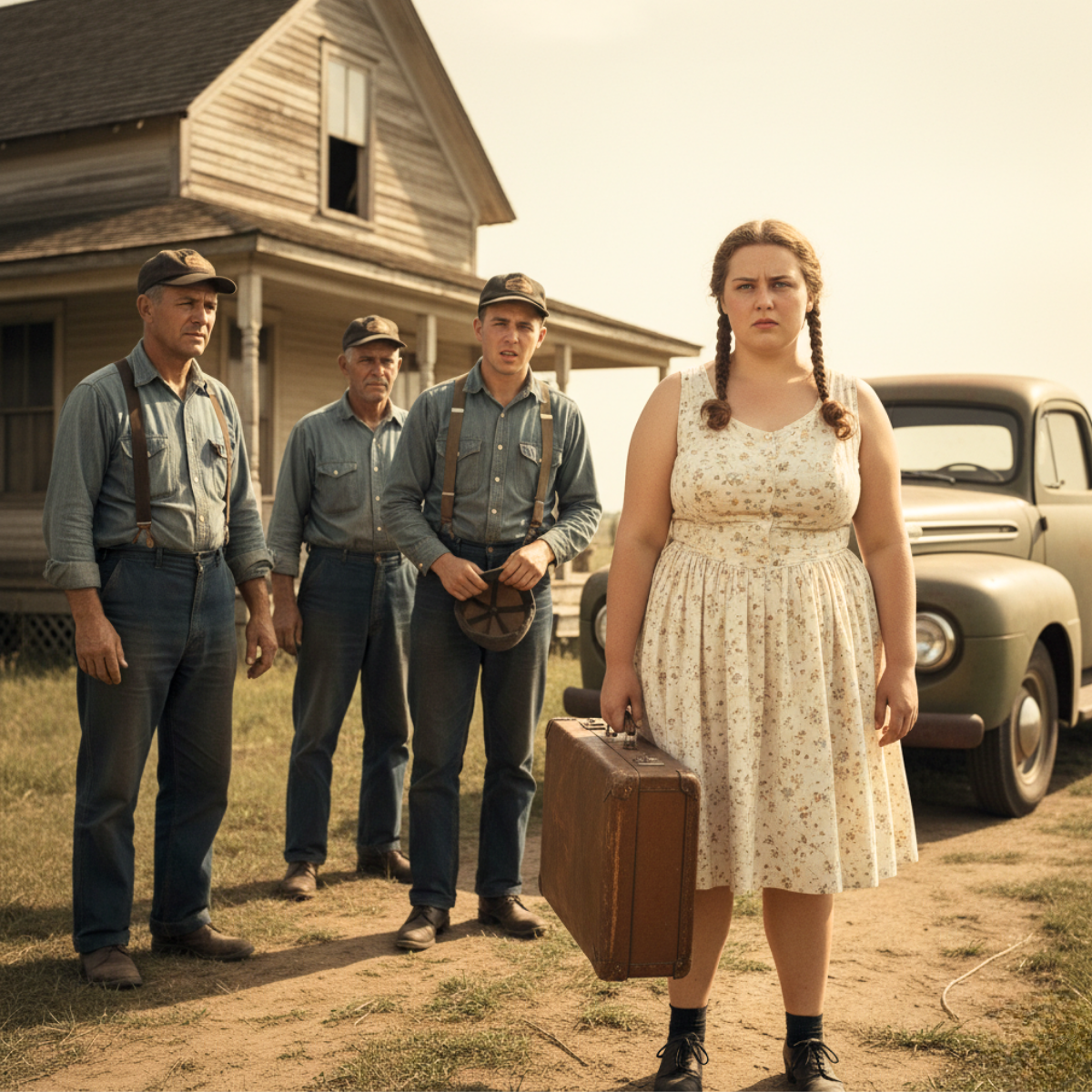 The dust swirled around the worn wheels of the old Chevrolet truck as it pulled up to the modest farmhouse in the late afternoon sun. 24-year-old Margaret sat in the passenger seat, her hands trembling as she clutched her battered leather suitcase. Her long blonde hair was braided simply, and her floral dress, though clean and carefully mended, showed signs of years of wear.