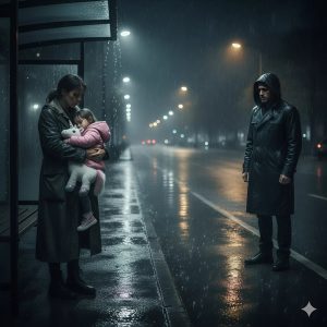 *La lluvia caía a cántaros, empapando la fina chaqueta de Amelia, mientras se acurrucaba en el frío banco metálico de la parada del autobús. chi
