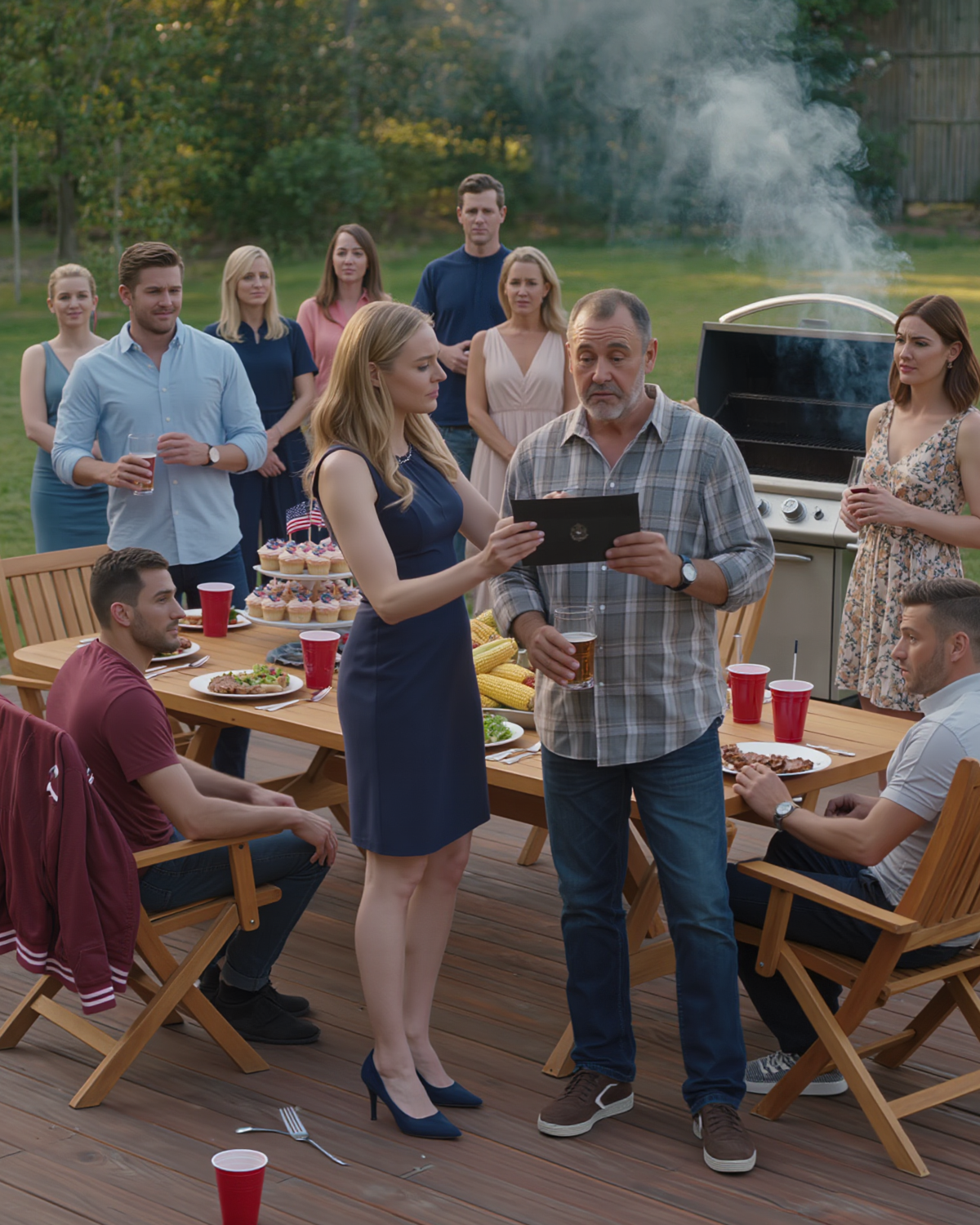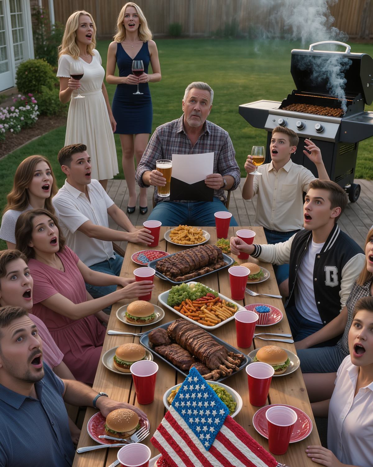 The backyard stilled. Only the grill crackled and the TV shouted into the distance. No one laughed. No one spoke. All eyes pinned that envelope and the hands hovering over it.